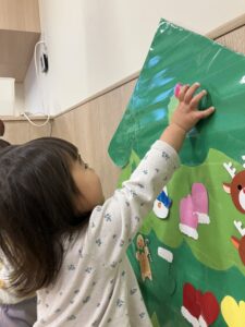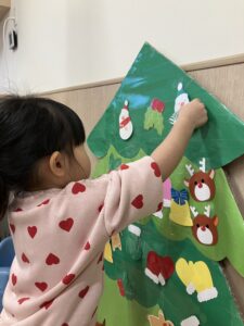 ホーム > 保育園のようす > クリスマス会(もりもり) 公開日 2025.12.27 クリスマス会(もりもり) 「25日はクリスマス会がありました🎵 あわてんぼうのサンタクロースとサンタッタという歌を演奏しました。 それから、お部屋の中の飾りを見つけてきて、ツリーに貼ってもらいましたよ! 「みつけた!」「みて!雪だるま!」など、子どもたちが楽しむ姿が見られました。 飾りつけが終わるとサンタさんが来てくれて、プレゼントももらいました。 遠くから手を振ったり、ハイタッチしたり、様々な様子が見られました。 給食のクリスマスメニューもとってもかわいくて、大喜びの子どもたちでした。」