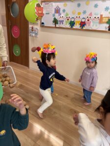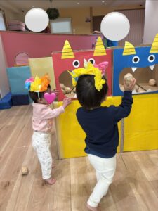 節分の絵本やお話を聞いた後、風船やダンボールでできた可愛らしい鬼に、新聞で作った豆をぶつけて豆まきを楽しみました♪